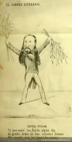 After only a year, he quit and became an illustrator for the political daily El Correo Literario, which was critical of the Conservative Republic. Although handicapped by old, malfunctioning equipment and a dearth of decent supplies, he created a huge number of portrait caricatures of notable people (including his old nemesis, Ciccarelli), with humorous captions or poems by Guillermo Matta.[1] As might be expected, there was much official opposition. President Manuel Montt called on them to stop publishing "esos monos groseros" (those crude monkeys). After less than a year of operation, they had to close up shop, at least temporarily.
