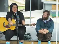 Kimya Dawson with Paul Baribeau in June 2014. The two are wearing matching socks with a design similar to many of Dawson's album covers, with the words "Kimya Dawson Loves Me" appearing amongst cartoon rabbits.