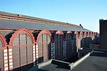 In the mid-20th century, the building's condition had deteriorated to the point that its demolition was being considered. The station was closed on 31 January 1986 for safety reasons, after which restoration work to the roof (starting at the end of March 1986 and finishing in September 1986) and façades was performed. The stress problems due to the impact of bombs during the war were reportedly solved by the use of polycarbonate sheets instead of glass, due to its elasticity and its relatively low weight (40% less than glass), which avoided the need for extra supporting pillars.[3] After replacing or repairing steel elements, they were painted burgundy. Copper was also used in the renovation process of the roof.[3]