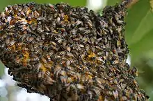 Apis florea nest, Thailand. The nest is 20 cm in diameter and contains approximately 3600 cells on each side. The reflective substance on the branch either side of the nest is propolis which acts as a sticky and chemically repellent barrier to protect the nest from ants, particularly weaver ants (Oecophylla smaragdina).[8] The curtain of bees covering the comb is 3–4 bees thick (~10 mm).