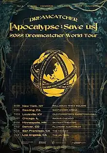 2022 Dreamcatcher World Tour Apocalypse: Save Us, also known as 2022 Dreamcatcher World Tour [Apocalypse: Save Us] was a worldwide concert tour by the South Korean girl group Dreamcatcher. The tour began on June 28, 2022, in North America.[1]