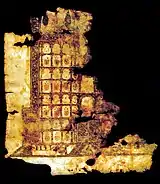 The Birmingham Quran manuscript is a parchment on which two leaves of an early Quranic manuscript are written. In 2015 the manuscript, which is held by the University of Birmingham,[15] was radiocarbon dated to between 568 and 645 CE (in the Islamic calendar, between 56 BH and 25 AH).[16][17] It is part of the Mingana Collection of Middle Eastern manuscripts, held by the university's Cadbury Research Library.[16] The manuscript is written in ink on parchment, using an Arabic Hijazi script and is still clearly legible.[17] The leaves preserve parts of Surahs 18 (Al-Kahf) to 20 (Taha).[18] It was on display at the University of Birmingham in 2015 and then at Birmingham Museum and Art Gallery until 5 August 2016.[19] The Cadbury Research Library has carried out multispectral analysis of the manuscript and XRF analysis of the inks.[20]