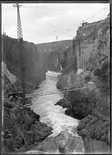 The Arapuni Suspension Bridge, just downstream from the power station, was opened in 1926. It gave access from 'top camp' (which eventually became the Arapuni township) on the true right to the power station construction site on the true left of the Waikato River.[6]