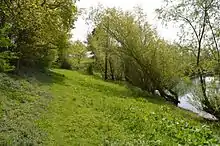 The site is divided into two areas. The main one is L-shaped, forming the sloping south-east and north-east borders of a water filled pit. A footpath between Slough Lane and Park Farm runs along its north-east boundary. East of the main site is a small linear feature which has been filled in. It is on private land with no public access.