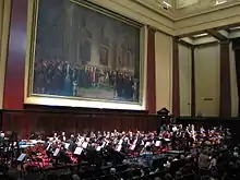 The installation of a dictatorship under General Juan Carlos Onganía led to a marked influence of the Catholic Church over the repertoire, and its new director, Juan Carlos Zorzi, offered up mostly requiems, masses and te deums, as well as frequent collaborations with the Argentine Catholic University's choir. The symphony performed at the reinauguration of the Cervantes Theatre, which had been nearly lost to a 1961 fire, in 1968, though the Onganía regime's continuing hostility to the symphony led to its being stripped of a formal home, and the body performed as a radio orchestra. Losing numerous musicians, Zorzi resigned, and though the 1970 appointment of Spanish conductor Jacques Bodmer as director was followed by a sponsorship from the Italian Embassy, lack of federal support kept the symphony on the brink of closure throughout 1971 and 1972.[3][4] The election of Peronist candidate Héctor Cámpora in 1973 brought with it restored support for the institution, including disbursement for a year's worth of unpaid salaries. A successful Beethoven series at the Luna Park Arena was followed by the 25th anniversary concert, November 29, 1974, memorable for its being held atop the Buenos Aires Sheraton with a televised reprise of Roberto Kinsky's inaugural program. A renewed funding crisis led director Bodmer to return to Barcelona in July 1975, however, and his assistant, Jorge Fontenla, was appointed in his stead. Fontenla's replacement with Bruno D'Astoli in 1978 coincided with the symphony's eclipse by the Buenos Aires Philharmonic, which enjoyed the advantage of a permanent home at the Colón Opera House (while the symphony was relegated to Monday nights at the Cervantes). Its struggles helped result in the 1980 establishment of the Friends of the National Symphony, and though the end of the last dictatorship in 1983 brought with it high hopes, a conflict with the newly appointed general director, Iván Cosentino, resulted in a stoppage during the first half of 1985. Ongoing budgetary problems prompted the new director, Jorge Rotter, to schedule free concerts to the public every other Wednesday as a form of protest during 1987. A renewed crisis in 1990 led to his resignation and the suspension of activities.[2]