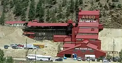 The Argo Gold Mine and Mill is a former gold mining and milling property in Idaho Springs, Colorado, featuring an intact gold mill built at the entrance of the Argo Tunnel. The tunnel was built between 1893 and 1910 to drain the gold mines in Virginia Canyon, Gilpin Gulch, Russell Gulch, Quartz Hill, Nevadaville, and Central City and allow easier ore removal. The success of the tunnel as an access route meant that a large volume of ore began exiting at the Idaho Springs entrance and a large mill was built to process it. At the time it was one of the largest such tunnels and milling operations in the world, directly recovering nearly $100 million in gold (11.2 million ounces) valued in 2023 at $10.1 trillion.[4][5] They also sent another $200 million of high-value ores to smelters in Denver.[6]