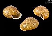 The shell is usually brown with numerous pale yellowish rows of spots and usually with a brown band above the periphery, occasionally yellowish, reddish or with greenish hue, weakly striated and with fine spiral lines on the upper side.[4] The shell has 5-5.5 convex whorls with deep suture.[4] The last whorl is slightly descending near the aperture.[4] The aperture is with prominent white lip inside.[4] The apertural margin is reflected.[4] Umbilicus is entirely covered by the reflected columellar margin.[4]