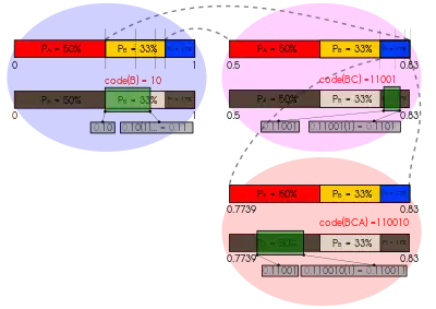 | A | 1/3 | [0, 85/256) | [0.00000000, 0.01010101) | 00000000 – 01010100 |