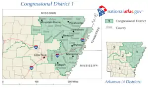 The district fully encompasses the counties of Arkansas, Baxter, Chicot, Clay, Cleburne, Craighead, Crittenden, Cross, Desha, Fulton, Greene, Independence, Izard, Jackson, Lawrence, Lee, Lincoln, Lonoke, Mississippi, Monroe, Phillips, Poinsett, Prairie, Randolph, Saint Francis, Searcy, Sharp, Stone, and Woodruff. The district also encompasses parts of Jefferson county.