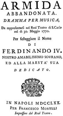 Armida Abbandonata (Armida Abandoned) is an opera in three acts by the Italian composer Niccolò Jommelli. The libretto, by Francesco Saverio De Rogatis, is based on the epic poem Jerusalem Delivered by Torquato Tasso. The opera was first performed at the Teatro San Carlo, Naples, on 30 May 1770. The young Wolfgang Amadeus Mozart was in the audience. He described the work as "beautiful but too serious and old-fashioned for the theatre". Nevertheless, despite a lukewarm reception at its premiere, Armida abbandonata was widely performed throughout Italy in the following years.
