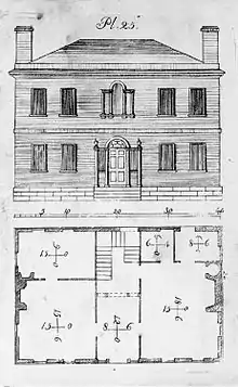 Benjamin's greatest influence is derived from his pattern books. The first written by an American architect, they introduced architectural history, style and geometry to ordinary builders in the field. He adapted many designs by James Gibbs and Colen Campbell of Great Britain to fit the scale and finances of New England communities. These handbooks provided superb drawings and practical advice for full house plans, including such details as circular staircases, doorways, fireplace mantels, dormer windows, pilasters, balusters and fences. He sketched proposals for dwellings and churches, even a courthouse. The archeological sources of his designs were scrupulously cited, from the Temple of Hephaestus in Athens to the Arch of Titus in Rome. Other architects, including Ithiel Town and Ammi B. Young, freely assimilated his plans, as did innumerable carpenters. Indeed, the charm of many early New England towns owes a debt to Asher Benjamin. The Ridge in Orford, New Hampshire features a series of houses based on designs from his books, many of which remain in print.[4] Although he helped disseminate the Federal style, he was not averse to changing fashions. In fact, his book published in 1830, The Architect, or, Practical House Carpenter, helped redirect American taste towards the Greek Revival movement.