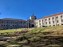 The Great Depression hit Asheville quite hard. On November 20, 1930, eight local banks failed.[40] Only Wachovia remained open with infusions of cash from Winston-Salem.[41] Because of the explosive growth of the previous decades, the per capita debt owed by the city (through municipal bonds) was the highest in the nation.[42] By 1929, both the city and Buncombe County had incurred over $56 million in bonded debt to pay for a wide range of municipal and infrastructure improvements, including City Hall, the water system, Beaucatcher Tunnel, and Asheville High School. Rather than default, the city paid those debts over a period of fifty years.[43]