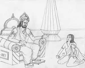 Little is known about the life or century in which Ashtavakra actually lived, except for the accounts found in the major Indian Epics (the Ramayana and the Mahabharata) and the Puranas. The legends state that sage Aruni, mentioned in the Chāndogya Upaniṣad, ran a school (Āśrama) teaching the Vedas. Kahoḍa was one of his students, along with Aruni's daughter Sujata. Aruni's daughter married Kahoḍa. She got pregnant, and during her pregnancy, the developing baby heard the chanting of the Vedas and learnt the correct recitation.[3] According to one version of the legends surrounding Ashtavakra, his father was once reciting the Vedas, but erred in correct intonation. The fetus spoke from the womb and told his father about the limited knowledge he was aware of from the Vedic books, there is much more to know apart from these books. The father got angry and cursed him to be born with eight deformities, hence the name 'Ashtavakra'.[1]