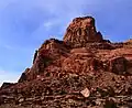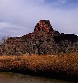 This erosional remnant along the San Rafael River is composed of Wingate Sandstone,[4] which is the remains of wind-borne sand dunes deposited approximately 200 million years ago in the Late Triassic.[5] The Wingate overlays lightly colored Chinle Formation around the lower slopes of the peak and the surrounding area is composed of Moenkopi Formation.