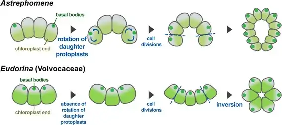 Colony inversion is believed to have arisen twice in the order Chlamydomonadales. Spheroidal colony formation differs between the two lineages: rotation of daughter protoplasts during successive cell divisions in Astrephomene, and inversion after cell divisions in Eudorina.[4]