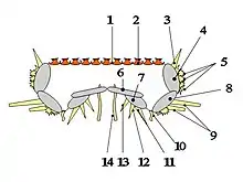 1- papulas: they are soft and retractable appendages with respiratory functions 2- paxilla 3- superomarginal spines 4- superomarginal plates 5- scales and small spines covering the vertical face of superomarginal plates 6- ambulacral plates 7- adambulacral plates 8- inferomarginal plates 9- inferomarginal spines 10- pedicellaria: special pedicels with prehensile termination necessary to grab bodies and detritus 11- external adambulacral spines 12- median adambulacral spines 13- internal adambulacral spines 14- ambulacral pedicellaria