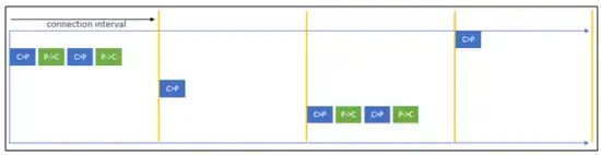 Figure 3 shows a basic exchange of packets, during two connection events with C>P indicating packet transmission by the Central device and P>C by the Peripheral.