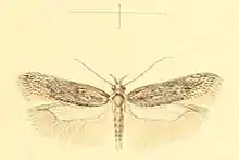 The wingspan is about 10–12 mm. The forewings are brown mottled with grey scales and with two black spots at the fold surrounded by orange, and an indistinct spot at one-third near the costa, another spot at three-quarters and two elongate orange spots in the middle. The subapical area is grey with some black scales. The hindwings are grey. Adults are on wing in October and November.