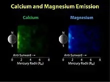 The fourth species detected in Mercury's exosphere was sodium (Na). It was discovered in 1985 by Drew Potter and Tom Morgan, who observed its Fraunhofer emission lines at 589 and 589.6 nm.[5] The average column density of this element is about 1 × 1011 cm−2. Sodium is observed to concentrate near the poles, forming bright spots.[6] Its abundance is also enhanced near the dawn terminator as compared to the dusk terminator.[7] Some research has claimed a correlation of the sodium abundance with certain surface features such as Caloris or radio bright spots;[5] however these results remain controversial. A year after the sodium discovery, Potter and Morgan reported that potassium (K) is also present in the exosphere of Mercury, though with a column density two orders of magnitude lower than that of sodium. The properties and spatial distribution of these two elements are otherwise very similar.[8] In 1998 another element, calcium (Ca), was detected with column density three orders of magnitude below that of sodium.[9] Observations by the MESSENGER probe in 2009 showed that calcium is concentrated mainly near the equator—opposite to what is observed for sodium and potassium.[10] Further observations by Messenger reported in 2014 note the atmosphere is supplemented by materials vaporized off the surface by meteors both sporadic and in a meteor shower associated with Comet Encke.[11]