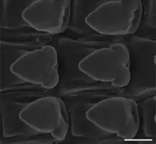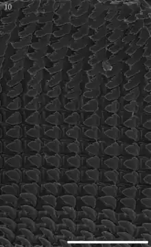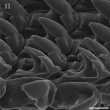 Radula: The large main cusp of the central tooth is accompanied by very small ectocones. The 7-8 adjoining lateral teeth in half a row have equally small ectocones. All these teeth have prominent basal plates with interrow support ridges. In the first marginal tooth, the main cusp is less symmetrical and the basal plate is less prominently developed. The following 12 (at least) marginal teeth are increasingly more asymmetrical initially, with an endocone, which increases in prominence towards the radular margin, whereas the ectones remain unicuspid or bicuspid at most.[1]