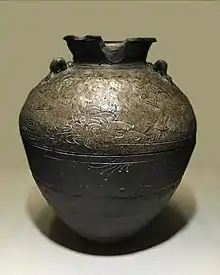 Jar with three decorative lugs, incised herons and reeds design, ash glaze, Final Heian period, 12th century. (Registered Important Cultural Property)