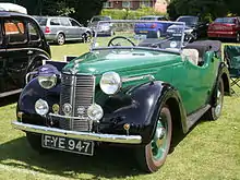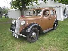 The design of the car was conservative with a pressed steel body built on a ladder chassis. The chassis was designed to give a low overall height to the car by dipping down by 2.75 inches (70 mm) between the axles. The 1125-cc four-cylinder side-valve engine producing 21 brake horsepower (16 kW) drove the rear wheels through a four-speed gearbox and open drive shaft to a live rear axle. Steering was by worm and wheel. Suspension was by half-elliptic springs all round mounted on silent-bloc bushes and damped by frictional shock absorbers. The four-wheel brakes were cable and rod operated by pedal or by hand lever on the offside of the speed lever. The electrical system was 6 volt. For the first year only, a four-door saloon was made in two versions. The basic model cost £155 and was capable of reaching 55 miles per hour (89 km/h) with an economy of 34 and the Sunshine or De-Luxe with opening roof and leather upholstery at £168. Bumpers were provided.[1][3] The chassis was priced at £120.[4]