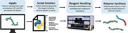 Over the years, multiple synthesizers have been developed to assist with automated synthesis, including the Chemspeed Accelerator (SLT106, SLT II, ASW2000, SwingSLT, Autoplant A100, and SLT100), the Symyx system, and Freeslate ScPPR.[14] Recently, researchers have investigated the optimization of these methods for controlled/living radical polymerization (CLRP), which faces issues with oxygen intolerance.[14] This research has led to the development of oxygen-tolerant CLRP, including with the use of enzyme degassing of RAFT (Enz-RAFT), atom-transfer radical (ATRP) that possesses tolerance to air, and photoinduced electron/energy transfer–RAFT (PET–RAFT) polymerization.[14] Through the use of liquid-handling robots, Tamasi et al. demonstrated the use of automated synthesis with executing multi-step procedures, enabling the reactions to investigate more elaborate schemes, such as with scale and complexity.[14]