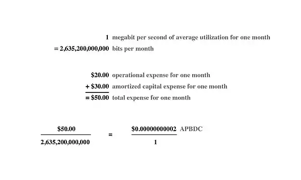 Average Per-Bit Delivery Cost divides the cost of however many bits were actually modulated across a network or component of a network over a period of time by the total operational and amortized capital expenses associated with the network or component over the same time-period, to produce an average cost for the delivery of each transmitted bit of data.[2] This is contrasted principally with flat-rate and 95th percentile functions, which are typically used for billing customers rather than cost accounting. In typical use, APBDCs of individual links or components of an operating network are compared with the APBDC of the whole, in order to evaluate the efficiency of the components and to track improvements in efficiency.[3][4]