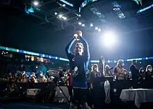 Aylsworth celebrates with VfB Friedrichshafen fans after winning the 2022 DVV German Cup