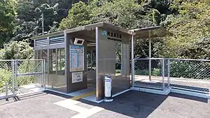 The station consists of a side platform serving a single track. A simple metal structure in a modern style serves as a waiting room by the platform. A large bike shed is available outside the station but a fee is required for parking.[2][3][5] The station is unstaffed but the staff at the shelter managing the bikeshed also sell some kinds of tickets as a kan'i itaku agent.[6]