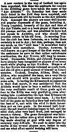 The Athletic started operations with a 4–3 friendly defeat to Kilmarnock on 29 September 1888.[7] The club had been founded too late to enter the Scottish Cup, but did enter the Ayrshire, and it won its first round tie 5–3 at Galston, brothers Hugh and John Aitken scoring three of the goals.[8]