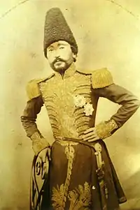 It is believed that Qajars, came to Iran in the 13th century, and then to the South Caucasus,[25] was one of the Turkic tribes in Hulagu Khan's army.[26] There is a legend that the name of the Qajar comes from the Mongol leader Qajar Noyan.[27] According to Mirza Hasan Zonuzi Khoyi, the origin of the Qajar is Turkestan Mongols.[28] However, other sources think that the Qajars did not come from the Mongols, but from the Khazars.[29][30]