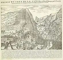 Contemporary depiction of the capture of the Fort de la Cluse by Lieutenant Lurbigny three months after his capture of the Bâtie-Beauregard