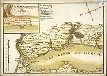 In 1719, David Vasserot, who was a son of the Huguenot banker Jean Vaserot war and married into the Genevan Turrettini family of theologians, purchased the title and land of La Bâtie.[8] His descendants remained the owners until the 19th century.[3] Following the 1815 Treaty of Paris, France relinquished Collex and five other municipalities to the canton of Geneva which was thereby connected through a land passage with the main land body of Switzerland.[9] At the end the 19th century, the historian Claudius Fontaine-Borgel, who worked as a secretary at the town hall of Versoix, started writing a history of the Bâtie-Beauregard. The manuscript, which has been kept in the archives of the Bibliothèque de Geneve,[10] was never published, but obviously served as the basis for later historiography of the place.