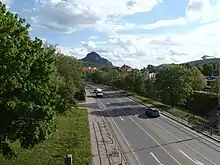 The town is dominated by two features. The steep hill of Bořeň is a large phonolite hill, dominating the town and its surroundings. It lies on the southern municipal border and is the highest point of the town at 539 m (1,768 ft) above sea level. It lies in the eponymous national nature reserve.[3][4] The second feature is the giant lignite mine Bílina which seriously changed and damaged surrounding landscape.