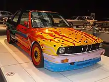 In addition to the work commissioned by BMW, other artists have created unofficial BMW art cars. In 1979 racing driver Peter Gregg purchased a BMW M1 Procar and commissioned his friend Frank Stella to paint it for him; this car is the only BMW painted by an artist who was also part of BMW's own Art Car program.[16] and was sold from the Guggenheim Museum to a BMW dealer in Long Island, New York in 2011.[17] The car is part of Stella's "Polar Coordinates" series, created to commemorate Stella's friend Ronnie Peterson who had died in a racing incident at Monza in 1978.[16][18] In 1987 Keith Haring painted a red BMW Z1 at Hans Mayer Gallery, Düsseldorf.[19] In 1996 Artist Dennis Simon was commissioned to create a BMW Motorsport tribute on the flanks of a 1965 BMW 1800 Ti/SA for BMW's 80th birthday at the Monterey Historics in Laguna Seca, CA. In 2007, Portland's Museum of Contemporary Craft commissioned artist Tom Cramer to paint a 1977 BMW 320i for their grand opening at the DeSoto Building.[20][21] In 2016, the Cultural Council of Greater Jacksonville commissioned artist Christie Chandler to paint a BMW X6 for their annual awards gala at TPC Sawgrass.[22][23]