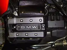 The three-cylinder BMW K75 was developed alongside the K100, but was introduced a year after the K100 as a marketing strategy.[10][11] The K75 engine had the same bore and stroke as the K100, yielding a displacement of 740 cc.[11] Its crankshaft had 120° between the throws[12][13] and was counterbalanced by balance weights added to the water pump accessory shaft, which ran at engine speed as is correct for a 120° straight-three engine.[10] The balance shaft made the K75's engine smoother than the K100's engine.[10][14] To increase the smaller engine's power, the K75's engine was given longer valve timing,[10] the compression ratio was increased to 11.0:1 from the K100's 10.2:1,[10][15] the combustion chambers were redesigned, the intake manifold was shortened, and the exhaust system was retuned.[15] The US market engine, specified to meet Environmental Protection Agency (EPA) requirements, produced 68 hp (51 kW); engines for all other markets produced 75 hp (56 kW).