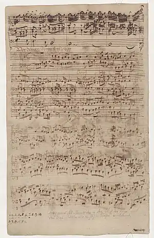The compositional technique in Variatio V can be compared with the five-part organ work Nun komm der Heiden Heiland of Georg Friedrich Kauffmann and with Bach's earlier partita, O Gott, der fromme Gott, BWV 767.[32] Referring to Scheibe's "sublime fire", Yearsley (2002) describes the overwhelming climax in the final stretto passage of Variatio V: "This contrapuntal density generates an expansion of the texture and with the accompanying dynamic boost bursts the shackles of counterpoint, erupting into expressive brilliance and grandeur—the ultimate rhetorical summation".[30][32][31]