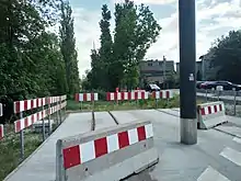Traffic has been stopped since the fall of 2017, following the impact of construction of a 15-storey facility on the river bank by Nordic Astrum.[8] During the first building works, the street ground was displaced, resulting in a small landslide that fissured the house at 8 Babia Wieś Street, damaging the road surface, unsealing a gas pipeline and weakening the foundations of the tram track. The repair of the 130 metres (430 ft) of missing tracks, necessary for a re-opening, is not foreseen before the end of 2023.[9]
