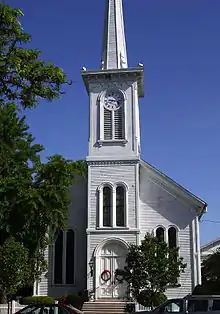 Babylon had already been settled, as Huntington South, prior to hostilities with the British in the Revolutionary War. The First Presbyterian Church of Islip and Huntington South, as it was then known, was established in 1730.[3] Though the church would later be split into two separate Huntington South and Islip churches in 1857 (the former to be renamed the First Presbyterian Church of Babylon after 1872). However, long before this split, the First Presbyterian Church held services in the original wooden church until 1778 when British soldiers tore down the structure. The wood from the first church was taken west to Hempstead to construct a barracks for British troops. This event was more recent history when, on the eve of the War of 1812, Joshua Hartt gave an impassioned sermon encouraging the young men to defend the United States and prepare for a "righteous war."[4]