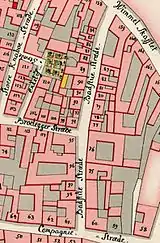 Badstuestræde is first mentioned in the Toskilde Bishops' Census Book from 1377. It was home to a row of market stalls that were moved to Købmagergade in about 1400. The street was named for a public bath house located at its southern end. It was one of three such public bath houses in the city at that time. The two others were located in Vestergade and at St Nicolas' Church. The House of the Holy Ghost in Niels Hemmingsens Gade had its own, private bath house. In 1496, the street was referred to as Strandbadstræde ("Beach Bath Alley"). The bath house was closed in 1509 but the street kept its name which was shortened to Badstuestræde in the 1740s.[1] The street was completely destroyed in the Copenhagen Fire of 1795 but rebuilt over the next few years.