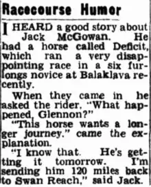 - ↑ Vox (15 May 1952). "Racecourse Humor". The Chronicle (Adelaide). Retrieved 30 July 2021.
