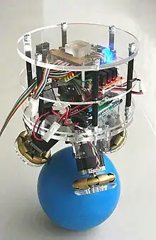 Yorihisa Yamamoto (Japan) inspired by Tomás Arribas's project, developed a ballbot using LEGO Mindstorms NXT in 2009.[38][39] He created a detailed demo to build, model and create controllers using MATLAB.[38] A group of mechanical engineering students at University of Adelaide (Australia) developed both a LEGO ballbot and a full-scale ballbot in 2009.[40] A group of students from ITMO University (Russia) introduced an algorithm and constructed a ballbot based on LegoNXT robotics kit which performed stability with only two actuators used.[41] Videos on YouTube present ballbots developed around the world. Some of them have been developed using LEGO Mindstorms NXT.[42][43][44][45][46] Other custom designs use omni-wheels to actuate the ball.[47][48][49][50]