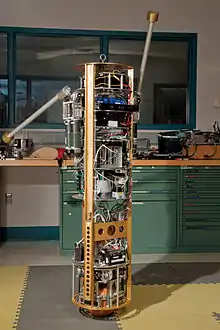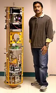 The CMU Ballbot,[1] the first successful ballbot, built by Prof. Ralph Hollis[2] (not in picture) at Carnegie Mellon University, USA in 2005