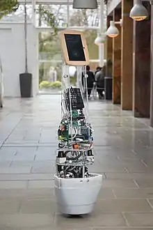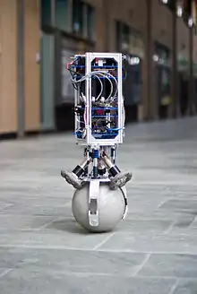 Due to its dynamic stability, a ballbot can be tall and narrow, and can also be physically interactive, making it an ideal candidate for a personal mobile robot.[8] It can act as an effective service robot at homes and offices and offer guidance to people in e.g. malls and airports.[51] The present day ballbots[8][29][32] are restricted to smooth surfaces. The concept of the ballbot has attracted a lot of media attention,[10][11][12][31][33] and several ballbot characters have appeared in Hollywood movies.[56][53] Hence, the ballbot has a variety of applications in the entertainment industry, including toys.