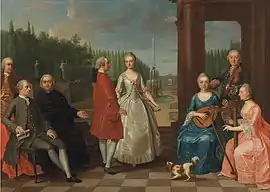 He painted a pair of family portraits of two generations of the Cremers family, one representing the family in an outdoor setting playing music and the second representing the wedding of the parents Cremer who are all seated and making music. In the first painting, Jacob Johannes Cremers is seated on the left side between the artist who portrayed himself standing with a palette in his hand and an ecclesiast.[13]