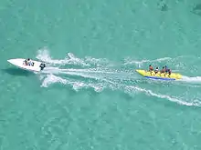 A banana boat (or water sled), is an unpowered, inflatable recreational boat meant to be towed.[1] Different models usually accommodate three to ten riders sitting on a larger, main tube and resting their feet on two laterally flanking tubes which stabilize the boat. The main tube is often yellow and banana-shaped. Some models have two main tubes.