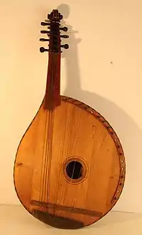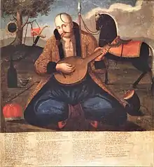 Musicians who play the bandura are referred to as bandurists. In the 19th and early 20th centuries traditional bandura players, often blind, were called kobzars.[3] It is suggested that the instrument developed as a hybrid of gusli (Eastern-European psaltery) and kobza (Eastern-European lute). Some also consider the kobza as a type or an instrument resembling the bandura.[4] The term bandura occurs in Polish chronicles from 1441. The hybridization, however, occurred in the late-18th or early-19th centuries.