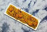 The Chittagong Hill Tracts are home to tribes with their own culture and cuisine.[39][40] Chakma cuisine uses sidol, a paste made from fermented shrimps and fish, and suguni, dried shrimp or fish.[41] Their dishes use more herbs from the hills more than the spices common in Bengali dishes.[41] Important seasonal ingredients include wild mushrooms and the Flowers of ginger and turmeric plants.[41] Sumoh gorang is a dish cooked in bamboo and Hebaang is baked in banana leaves in a mud oven.[41] Marma cuisine uses a paste of dried fish called nappi.[4] Rice beer is a popular drink.[4]