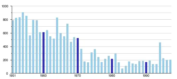 There is a significant inter-annual variation in the rainfall and, as a consequence, in the quantity of water flowing in the river. The drought that started at the beginning of the 1970s led to a very large reduction in the flow and up to the present time the volumes are still much lower than those observed in the 1950s and 1960s. The reduction in the flow of the river was much greater than the reduction in the rainfall. The average rainfall for 1981-1989 was 20% less than for 1961-1970 while the discharge of the river was reduced by 75%. The effect of the reduced rainfall was less extreme for other tributaries of the Niger. Over the same period the catchment basin of the Upper Niger suffered a similar 20% reduction in rainfall but the readings at the Koulikoro gauge station were only reduced to 50% of the earlier values.[8] Because of the accumulated groundwater deficit, even in a year with high rainfall, the discharge of the Bani River is less than in the wet decades of the 1950s and 1960s.[7]